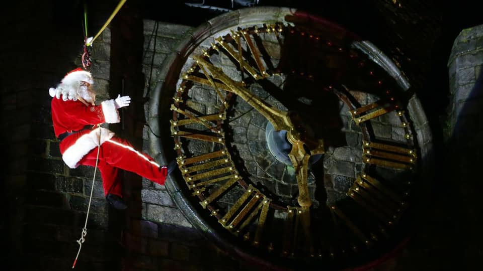 Grâce à une équipe de quatre cordistes professionnels, la mise en place est assurée en toute sécurité. L’un d’eux, costumé en Père Noël, réalise la descente, créant un moment inoubliable qui marquera les esprits.