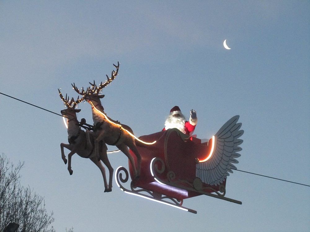 Au détour de son vol, il peut marquer une halte, saluer la foule et partager quelques mots avec petits et grands. Mais c’est à la tombée de la nuit que la magie devient totale : illuminations scintillantes, traîneau étincelant et rennes lumineux offrent un spectacle visuel grandiose qui transforme l’instant en pur enchantement.