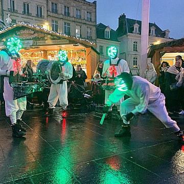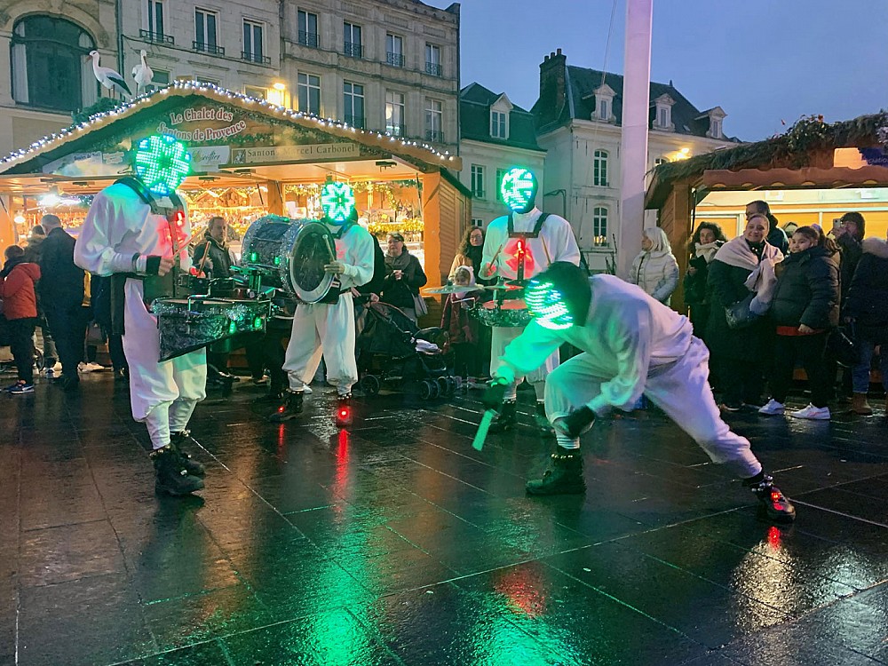 Leur univers lumineux, fait d’effets visuels surprenants et hors normes, captive le public et transforme les rues et marchés de Noël en véritables scènes à ciel ouvert. Participatif, énergique et totalement décalé, ce spectacle déambulatoire de percussions est une promesse de fête et de magie pour petits et grands.