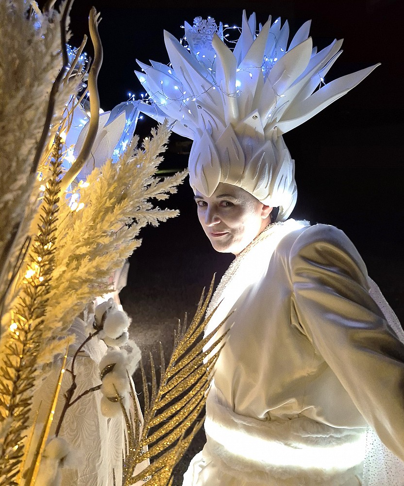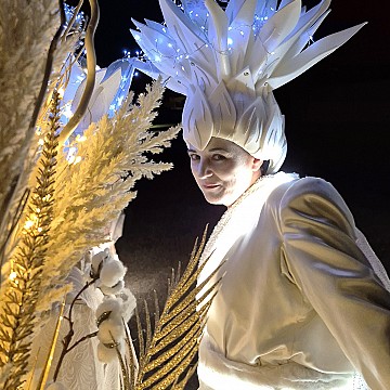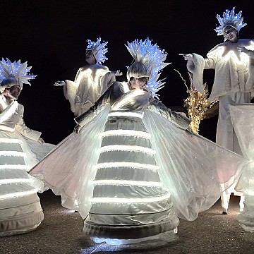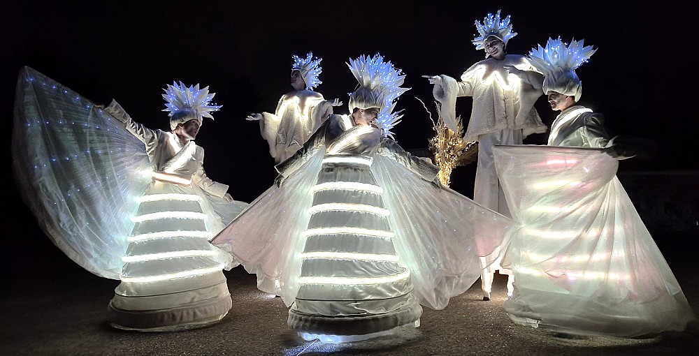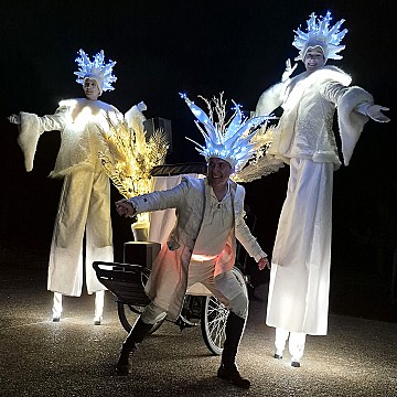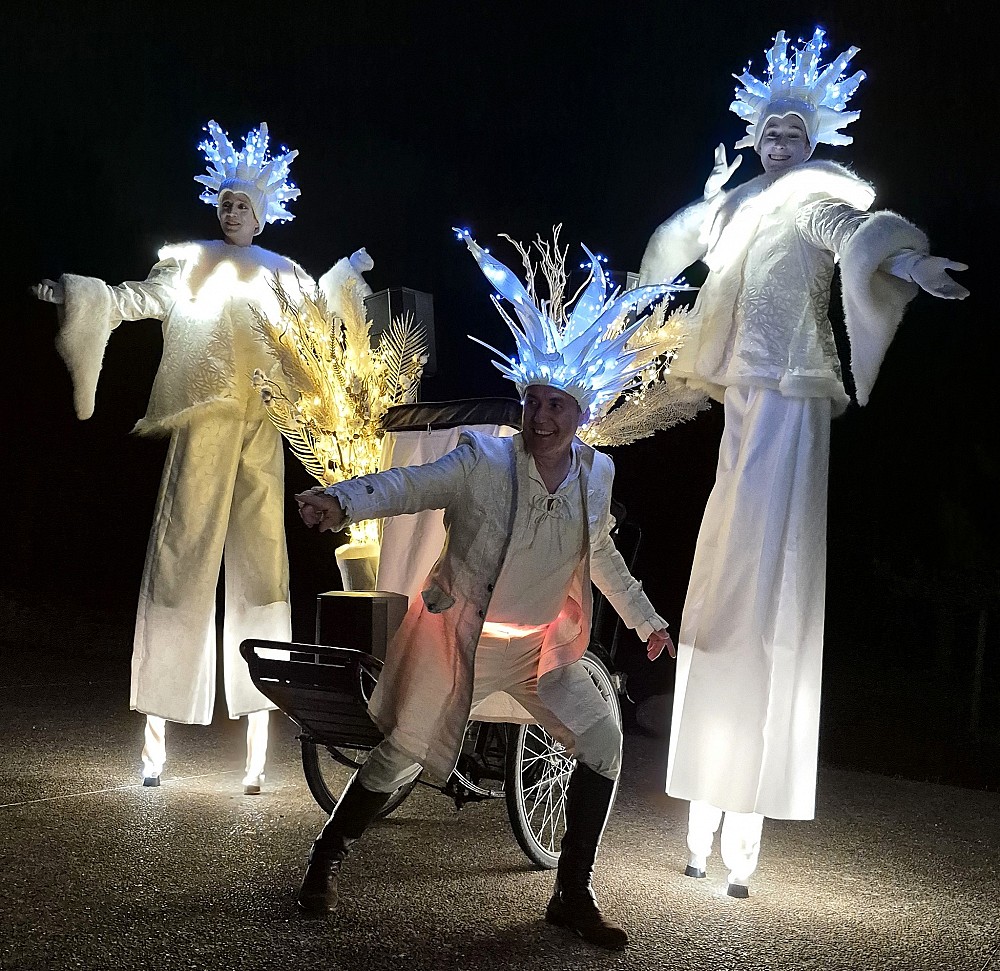 Entrez dans un univers givré où l’imaginaire prend vie… Sur 3 gyropodes lumineux, accompagnés de 2 échassiers majestueux et d’un personnage au sol avec son triporteur sonorisé, un cortège féérique envahit les rues.