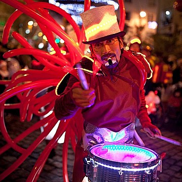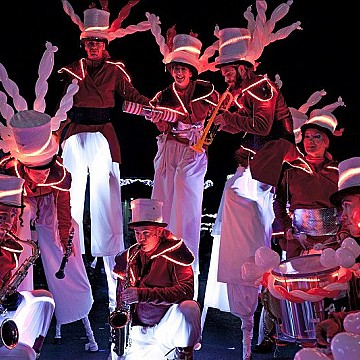 Un groupe d’artistes polyvalentes(cirque/musiciens)dont un technicien lumières: échassiers musiciens, acrobate/musicien, jongleurs/musiciens , danseurs/musicien et musicien, manipulateur de petite pyrotechnie pour le final. Une formule de 6 à 16 artistes